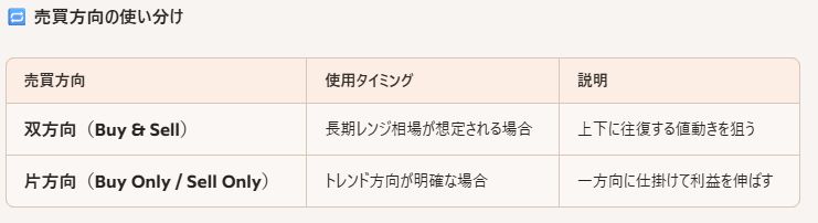 これらの設定により、グリッドの構成や動作が変化し、相場環境に応じた最適なトレードが可能になります。
