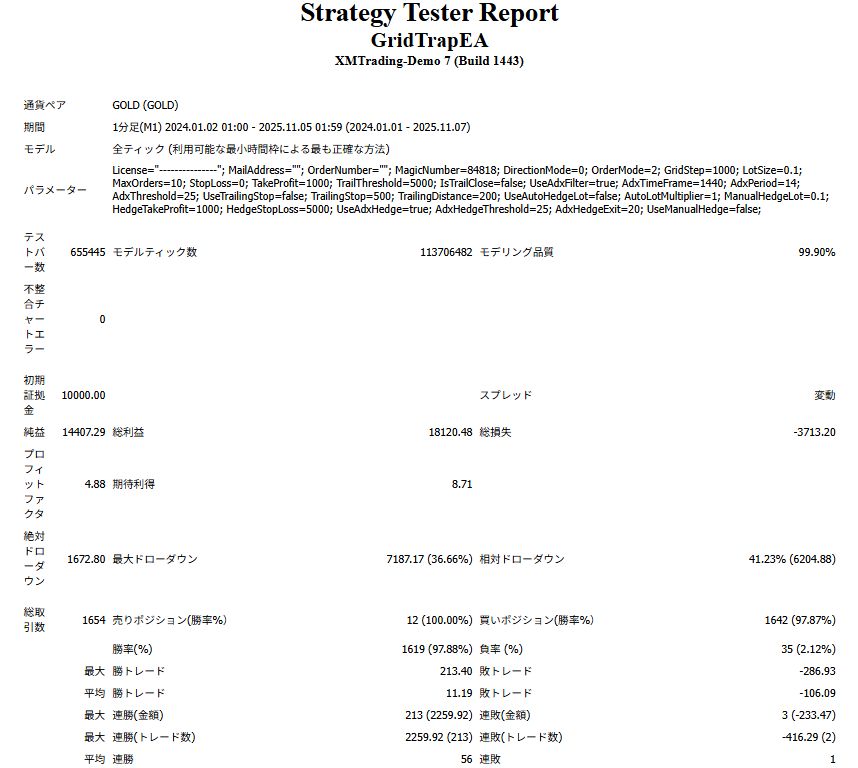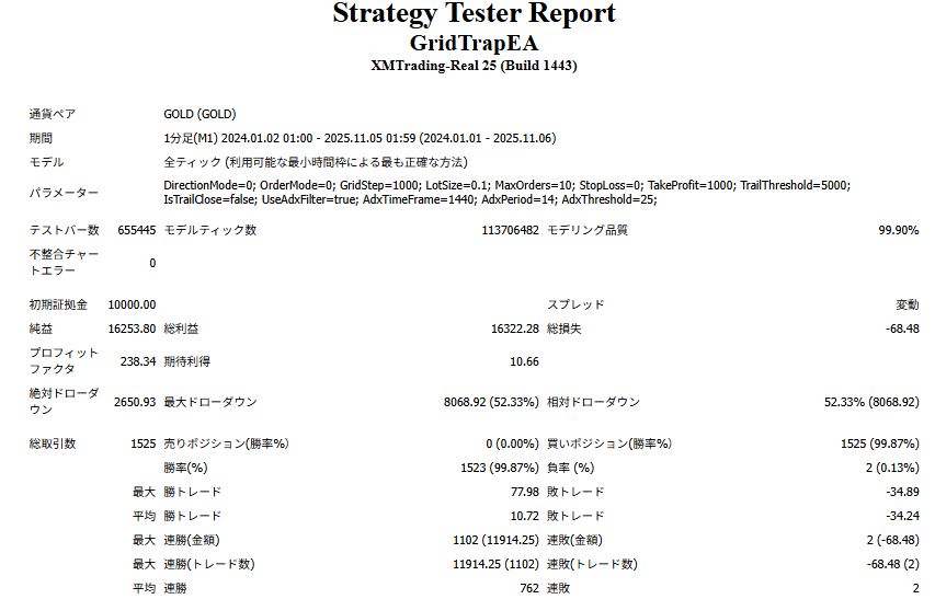 ・テスト期間中はゴールドの上昇トレンドが顕著だったため、買い方向に限定して運用。急激な下落も発生する場面があったため、ADXフィルターを併用し、強いトレンド時の自動トレード停止を実施